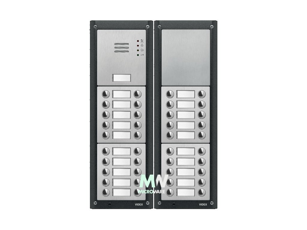 - Dveřní panel v provedení série 4000 je plně autonomní – vyžaduje pouze externí napájení a anténu a je rozměrově kompatibilní s ostatními komponenty domovního dorozumívacího systému Videx série 4000.