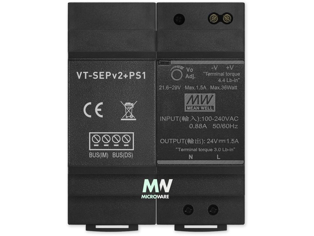 Zdroj se směšovačem napětí a dat - Zdroj na DIN lištu s výstupním napětím 24 V DC/1,5 A a se směšovačem napětí a dat pro videotelefony řady V-LINE. Napájení 230 V AC/0,48 A.