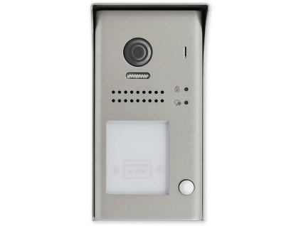 Venkovní 1tl. jednotka se čtečkou - Venkovní dveřní 1 tlačítková jednotka s fish-eye kamerou se 170° úhlem záběru a čtečkou karet pro povrchovou montáž. Obsahuje kameru, LED přisvícení, čtečku karet pro ovládání relé dveřního zámku, reproduktor a mikrofon.
